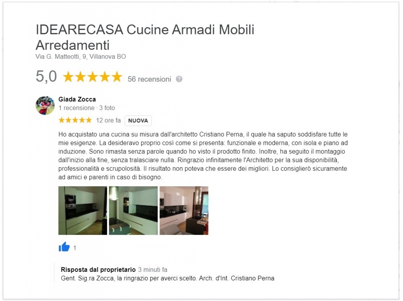 Recensione della Sig.ra Zocca di Valsamoggia - Bologna, cliente IdeareCasa. La cliente ha acquistato una cucina su misura con Isola per il suo nuovo appartamento. "Ho acquistato una cucina su misura dall'architetto Cristiano Perna, il quale ...
