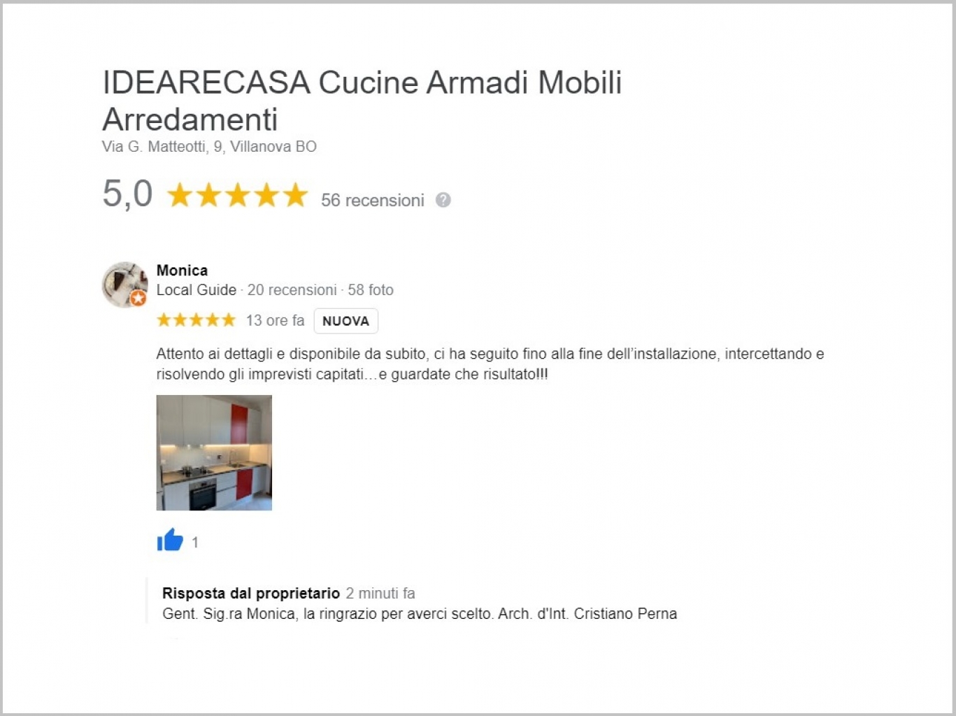 Recensione della Sig.ra Monica di Castel Guelfo - Bologna, cliente IdeareCasa. La cliente ha acquistato una cucina con HPL e Led per il suo nuovo appartamento. "Attento ai dettagli e disponibile da subito, ci ha seguito fino alla fine dell’installazione, ...
