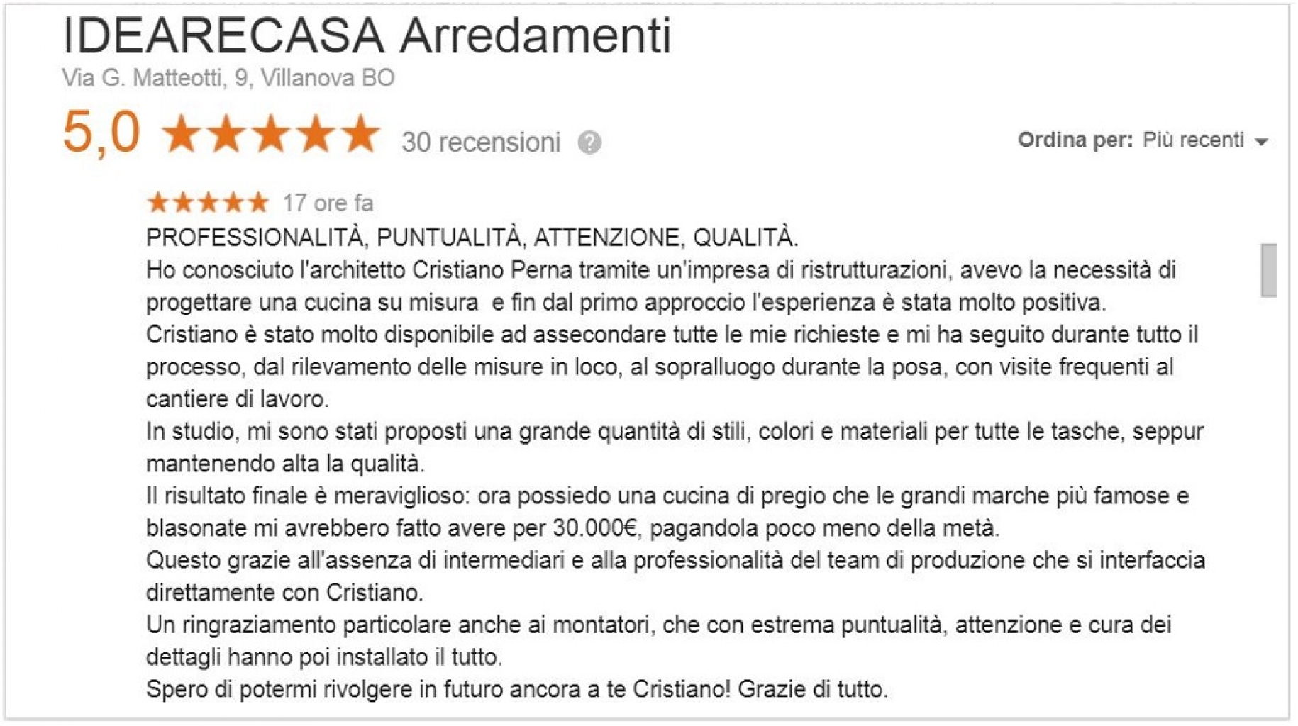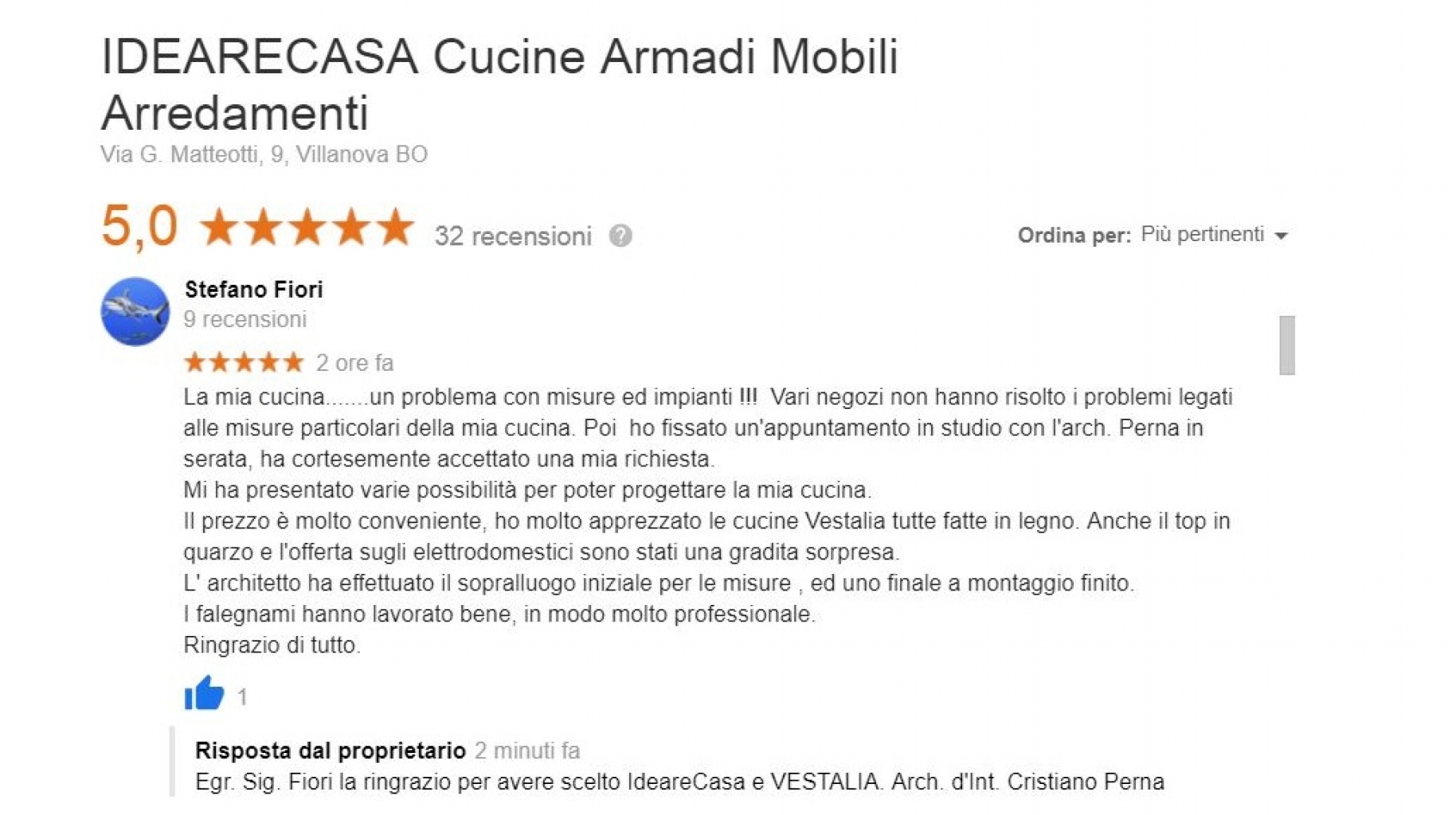 Recensione del Sig. Nascetti per IdeareCasa. Il cliente ha acquistato una cucina su misura per il suo appartamento di Bologna. "Assieme ai mie fratelli abbiamo acquistato i mobili della cucina per l'abitazione di mia sorella, appena ristrutturata ...