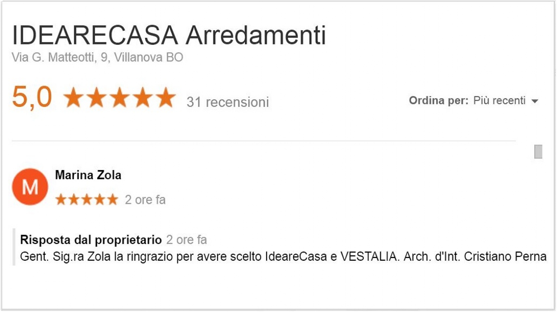 Consiglio di contattare IdeareCasa in quanto sono molto professionali e disponibili. Ho acquistato mobili su misura per la casa, con un'ottimo prezzo e qualità. Grazie all'architetto Cristiano Perna che ha risolto molte mie richieste. Il ...
