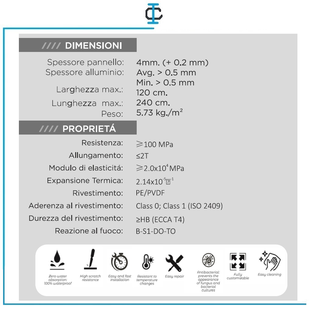 Rivestimento Doccia Fantasia di varie dimensioni e colori. Pannello realizzato in resina ed alluminio, come da scheda allegata. Si può tagliare in cantiere con disco dentato per alluminio. Può essere installato sia in orizzontale che in verticale. Misure max in cm.: L.120 H.240 sp.0,4 Caratteristiche tecniche nella scheda allegata. Installazione : - Deve essere realizzata da professisti - E' necessario che la parete sia liscia ed uniforme - Utilizzare colla poliuretanica Manutenzione : - Pulire con prodotti a PH neutro - Risciacquare abbondantemente con acqua per eliminarei resti del detergente ed asciugare - Per rimuovere eventuali residui, utilizzare un panno morbido con detergente a PH neutro e risciacquare - Evitare alcol, acidi e prodotti abrasivi Selezionare la misura desiderata. Scrivere nelle note : Tinta Consegna in 50 gg data ordine.
