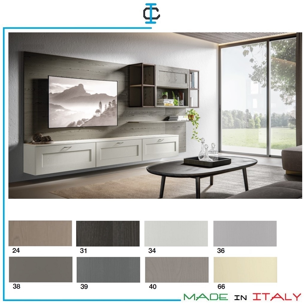 Soggiorno sospeso con zona TV. Soggiorno con struttura in finitura tinta bianco, con ante telaio in legno Frassino massiccio, finitura tinta 34 Bianco e Torba 24. Soggiorno composto da : 3 cesti sospesi, 1 pensile vasistas, 3 pensili a giorno. Stile Coloniale. Misure (cm): L.360 P.36 H.170