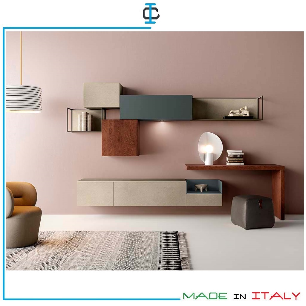 Soggiorno con Scrittoio. Soggiorno sospeso come foto composto da : cestoni, scrittoio, pensili a giorno, pensili con anta. Soggiorno realizzato in Pannello Ecologico in classe CARB P2, ante in finitura Argilla, laccato opaco Ardesia, Rovere Amaranto. Stile Contemporaneo. Misure (cm): L.340 P.32/41/51 H.250