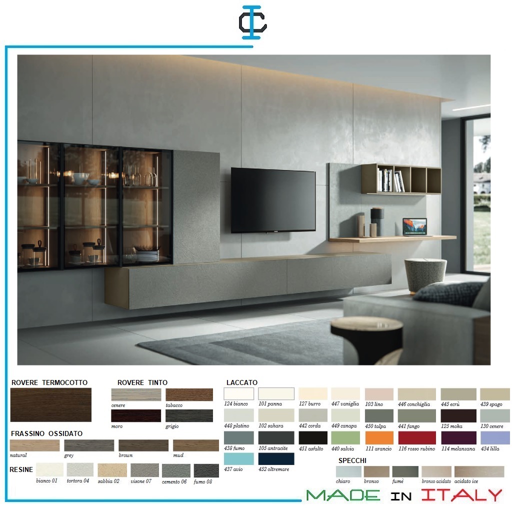 Soggiorno per TV 65 pollici sospeso. Soggiorno realizzato in Pannello Ecologico in classe E1, struttura e ante in finitura laccato opaco con tinte a scelta. Soggiorno composto da : Cestoni, pensile, vetrine con led, mensola pensile a giorno. Stile Contemporaneo. Misure (cm): L.608 P.45 H.171 da terra