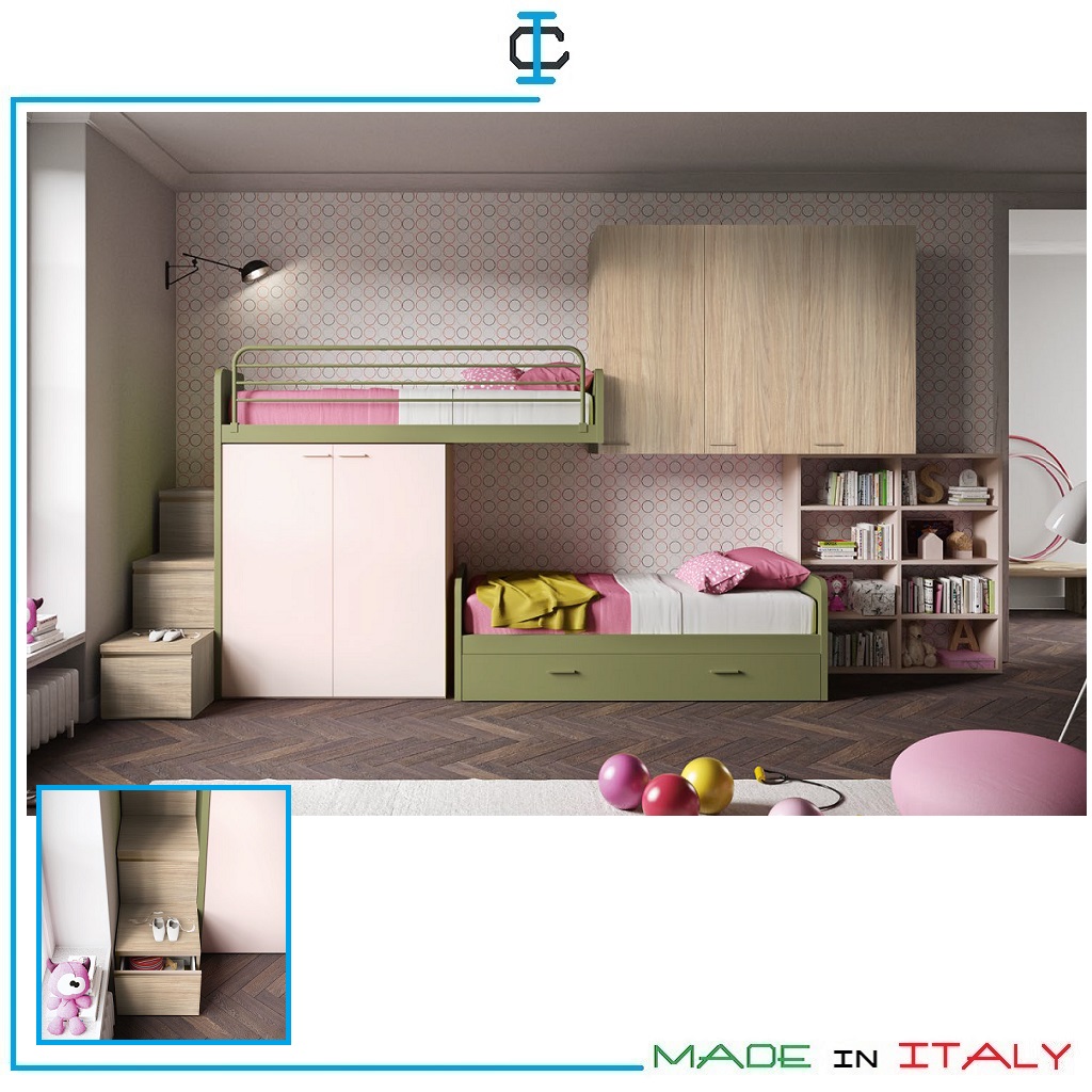 Soppalco 3 Letti. Cameretta composta da : scala, letto soppalco, armadio, libreria. Cameretta con struttura in Pannello Ecologico in classe E1 in finitura con tinte a scelta. Stile Contemporaneo. Misure (cm): L.496 P.127 H.258