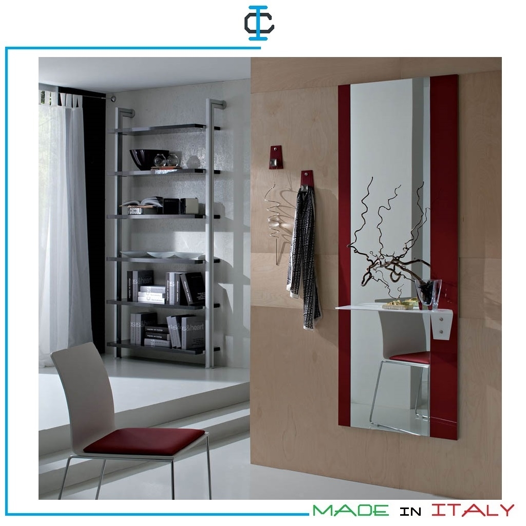 Specchio Rosso per ingresso composto da: Specchio alto con fasce laterali in vetro laccato rosso, mensola in metallo rivestita in cuoio rigenerato bianco, 2 appendini in metallo rivestiti in cuoio rigenerato rosso. Materiali e produzione Made in Italy.