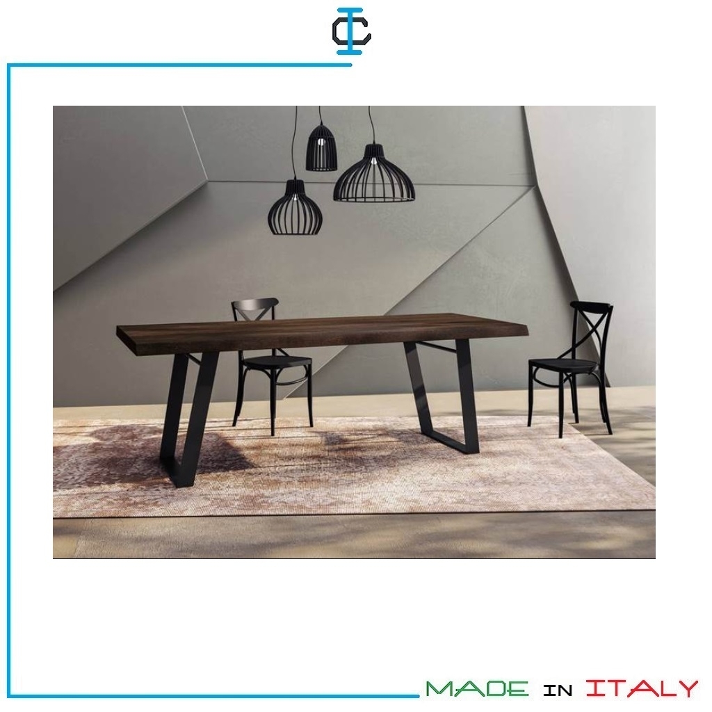 Tavolo in Rovere Scortecciato Caffè. Tavolo fisso con struttura in metallo e piano in Legno Rovere con bordo effetto scortecciato sp.4 cm. in finitura Caffè. Tavolo composto da: 1 basamento, 1 piano. Stile Contemporaneo. Misure (cm): L.180 P. 90 H.76