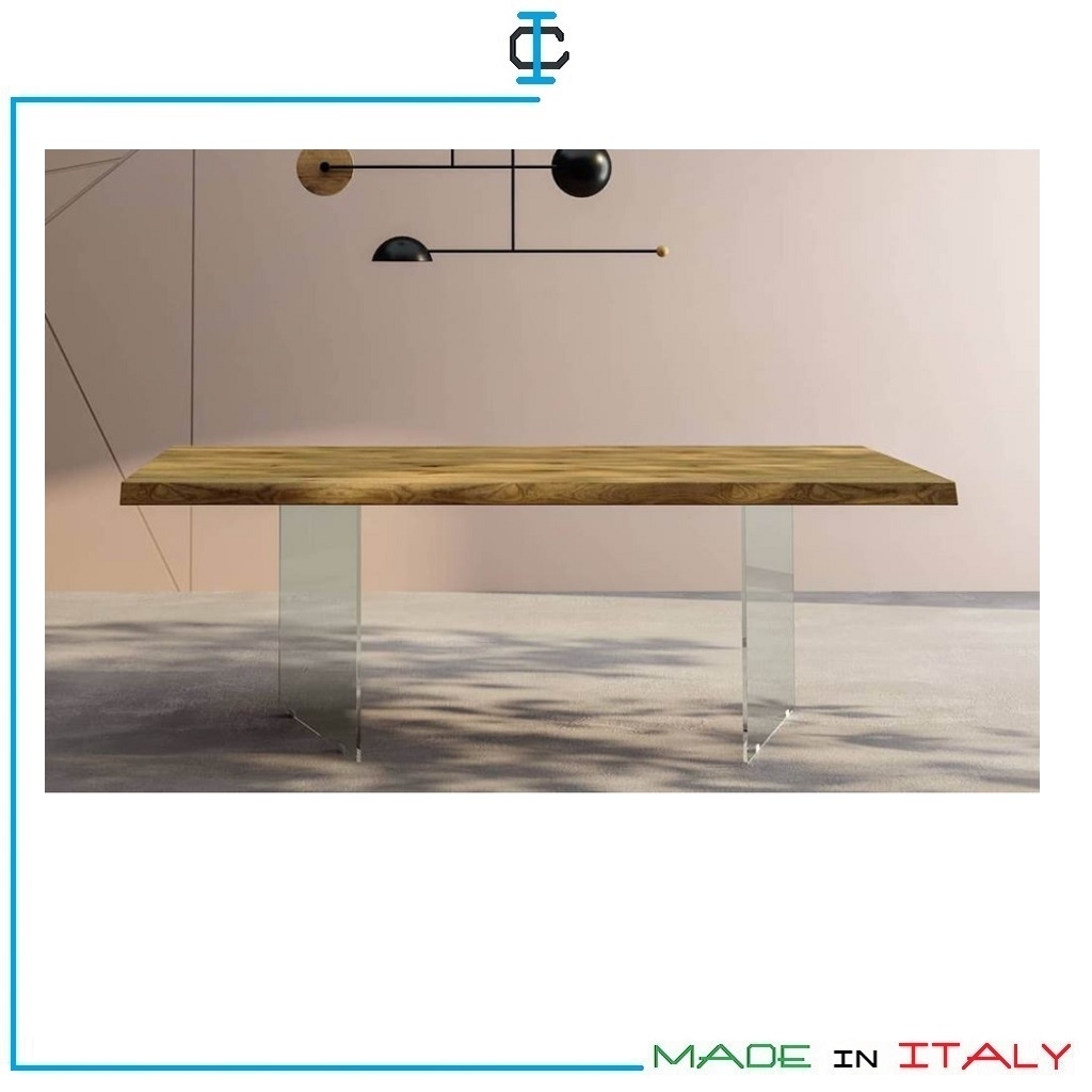 Tavolo in Vetro e Rovere. Tavolo fisso con basamento in Vetro e piano in Legno Rovere effetto scorticato sp.4 cm. Stile Contemporaneo. Misure (cm): L.180 P. 90 H.76