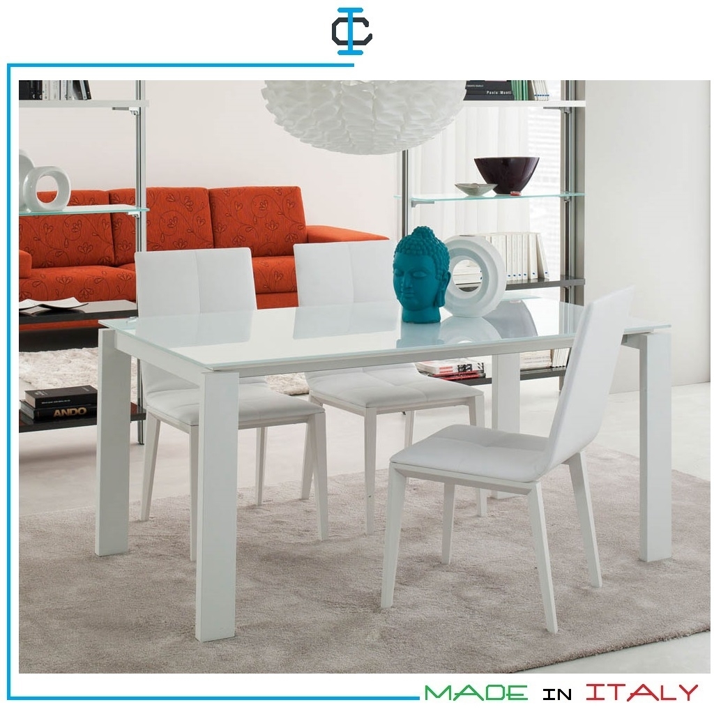 Tavolo Allungabile in Vetro con piano sp.10 mm ,  stile moderno, composto da:  Basamento in metallo laccato bianco a polveri epossidiche, guide in alluminio anodizzato, piano in vetro temperato da 10 mm. Materiali e produzione Made in Italy.