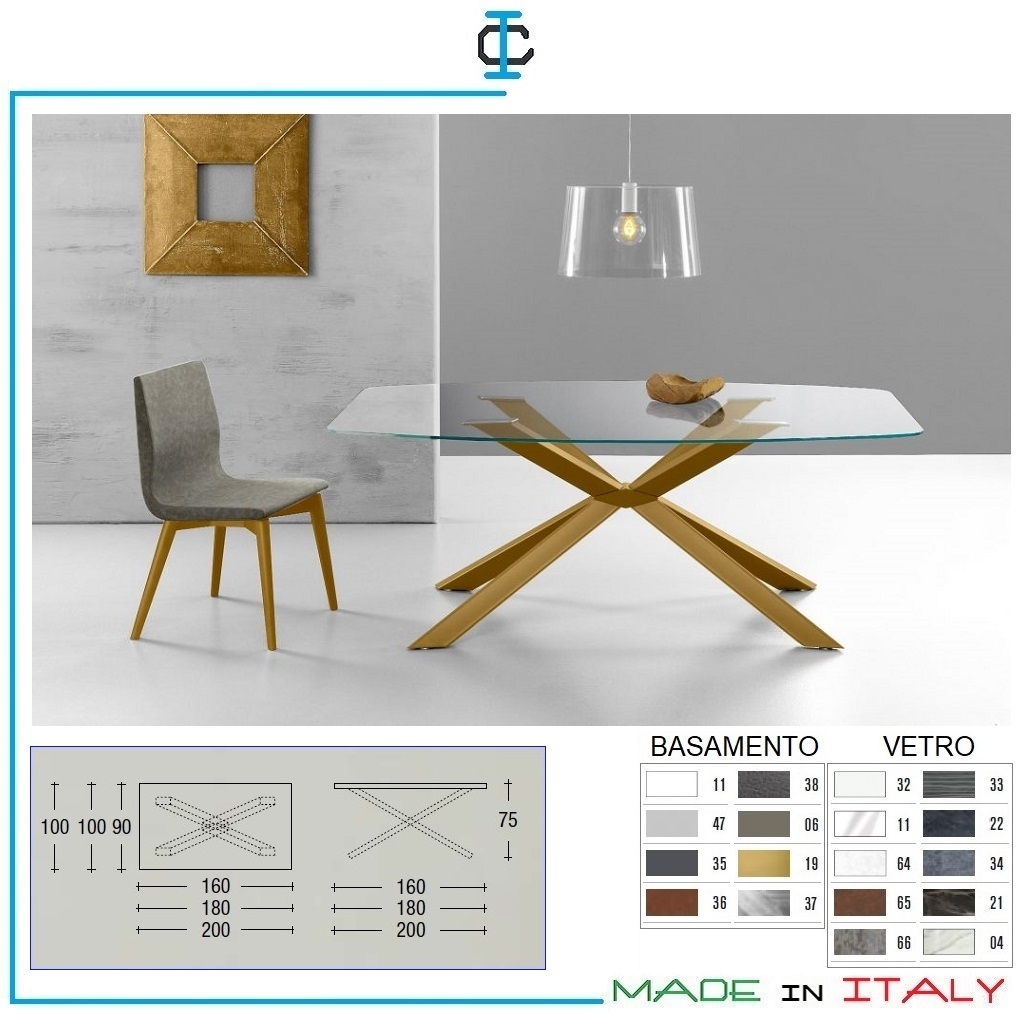 Tavolo con piano in Vetro e basamento tinta Oro. Tavolo fisso con piano in Vetro temperato sp. 10 mm. e basamento in metallo a doppia X tinta Oro. Design contemporaneo. Misure (cm): L.200 P. 100 H.75 Escluso : Sedie