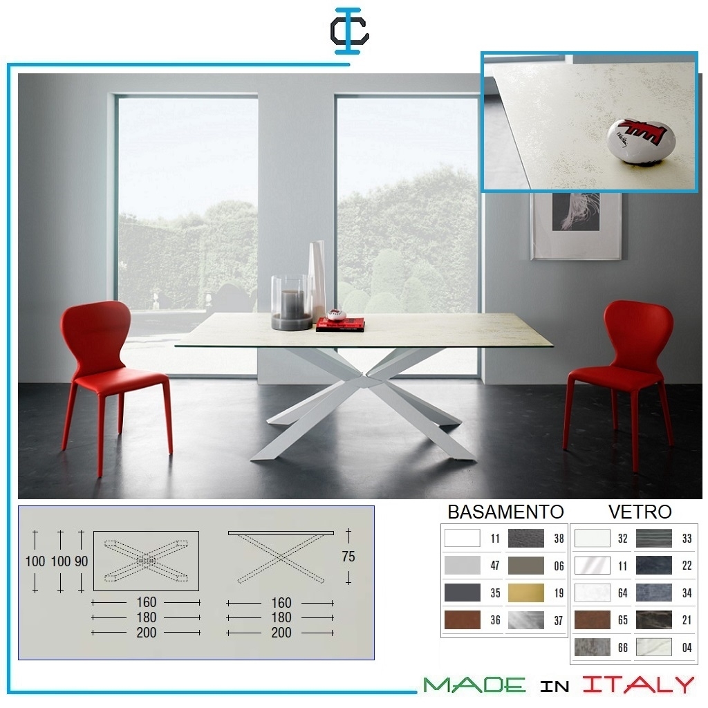 Tavoli disponibili anche nelle seguenti misure : L.180 P.100 ( € 1.950), L.200 P.100 ( € 2.040) Su richiesta è possibile scegliere le tinte del basamento e del vetro.