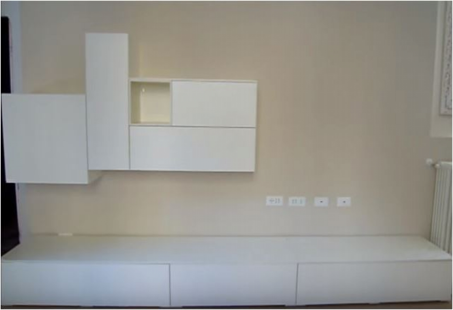 Parete attrezzata con ribalta bar per zona giorno. Parete soggiorno in finitura laminato bianco. Il soggiorno è composto da 3 basi con cestoni, 4 pensili con anta battente e ribalta bar, 1 pensile a giorno. Soggiorni realizzati con possibilità ...