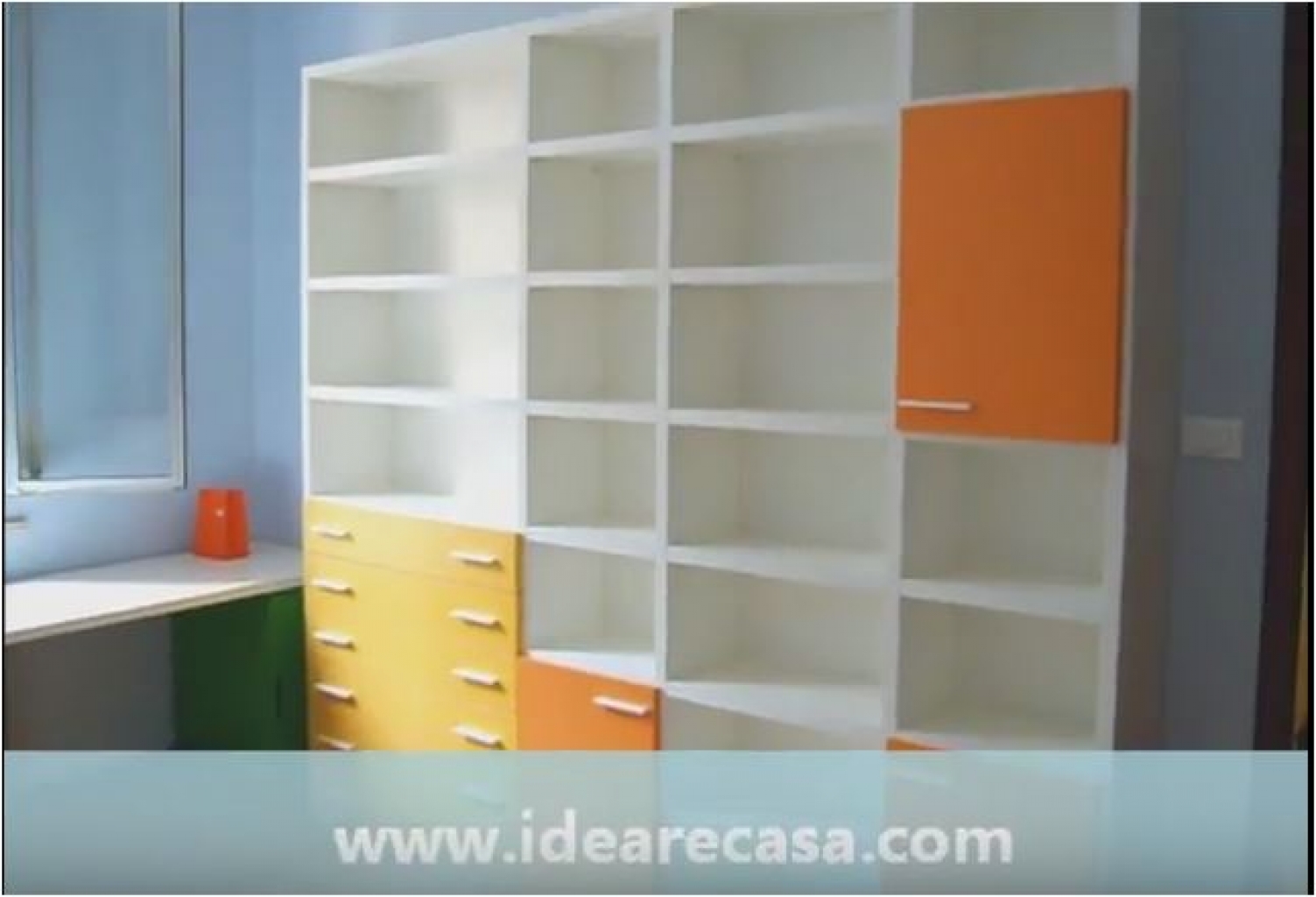 Libreria realizzata per una cameretta. Libreria in finitura laminato bianco con frontali in arancio, misura L.243 H.258 P.34 sp.3.6 . La libreria è composta da : 1 colonna con 6 cassetti e vani a giorno, 2 colonne con ante e vani ...