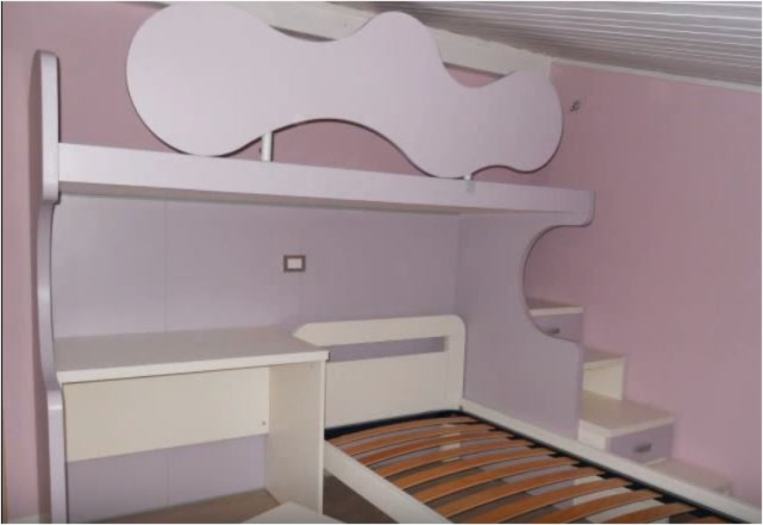Cameretta con Boiserie completa di 2 letti ed 1 scrivania. Sia i letti che la scrivania, scorrono su binari a parete. Cameretta completa di zona cassetti ed armadi ad ante battenti. Cameretta realizzata su misura per la mansarda. Camerette in pannello ...