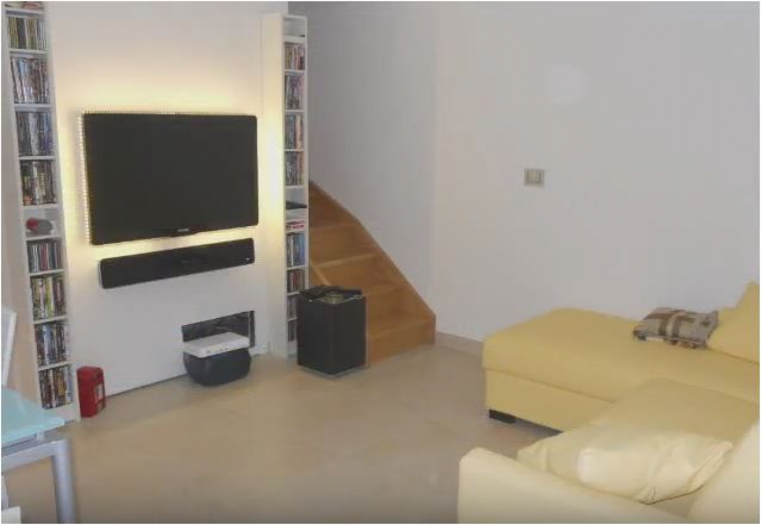 Divano con Penisola per soggiorno. Divano rivestito in ecopelle colore giallo. Il divano è composto da poltrona con 2 posti e penisola. Il rivestimento è in ecopelle sfoderabile. La zona TV è composta da 2 librerie porta cd e la TV ...