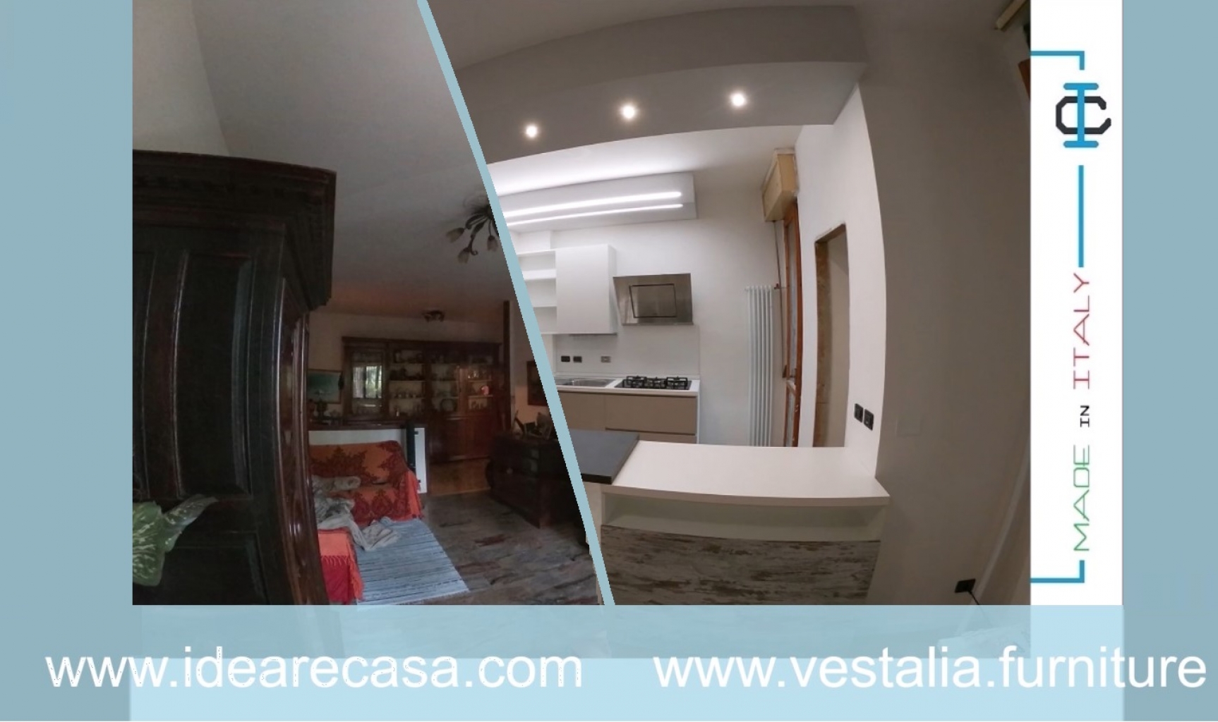 Cucina VESTALIA mod. Jessica con penisola e Ristrutturazione a San Lazzaro di Savena - Bologna. Cucina con struttura in legno listellare, in finitura Tessuto e Vintage; top in tinta Bianco e penisola in tinta Pietra. Cucina completa di : zona cottura ...