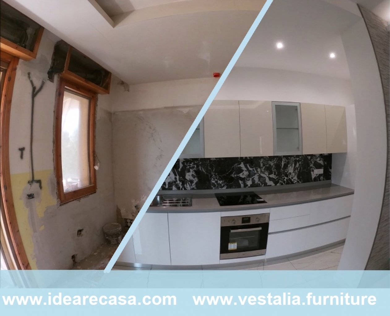 Cucina VESTALIA mod. Francesca con top in quarzo a Castenaso - Bologna. Cucina con struttura in legno listellare, ante in finitura laccato Lucido, gola, top in quarzo Grigio. Cucina completa di : zona lavello, zona cottura, cestoni, colonna frigo, ...