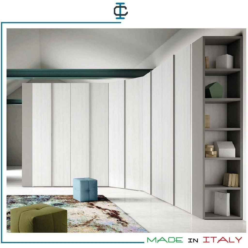 Armadio angolare in laminato con 10 ante battenti e 2 librerie. Colori personalizzabili. Struttura in pannello ecologico certificato. Due tubi ed un ripiano inclusi per ogni singolo vano. Design Contemporaneo
