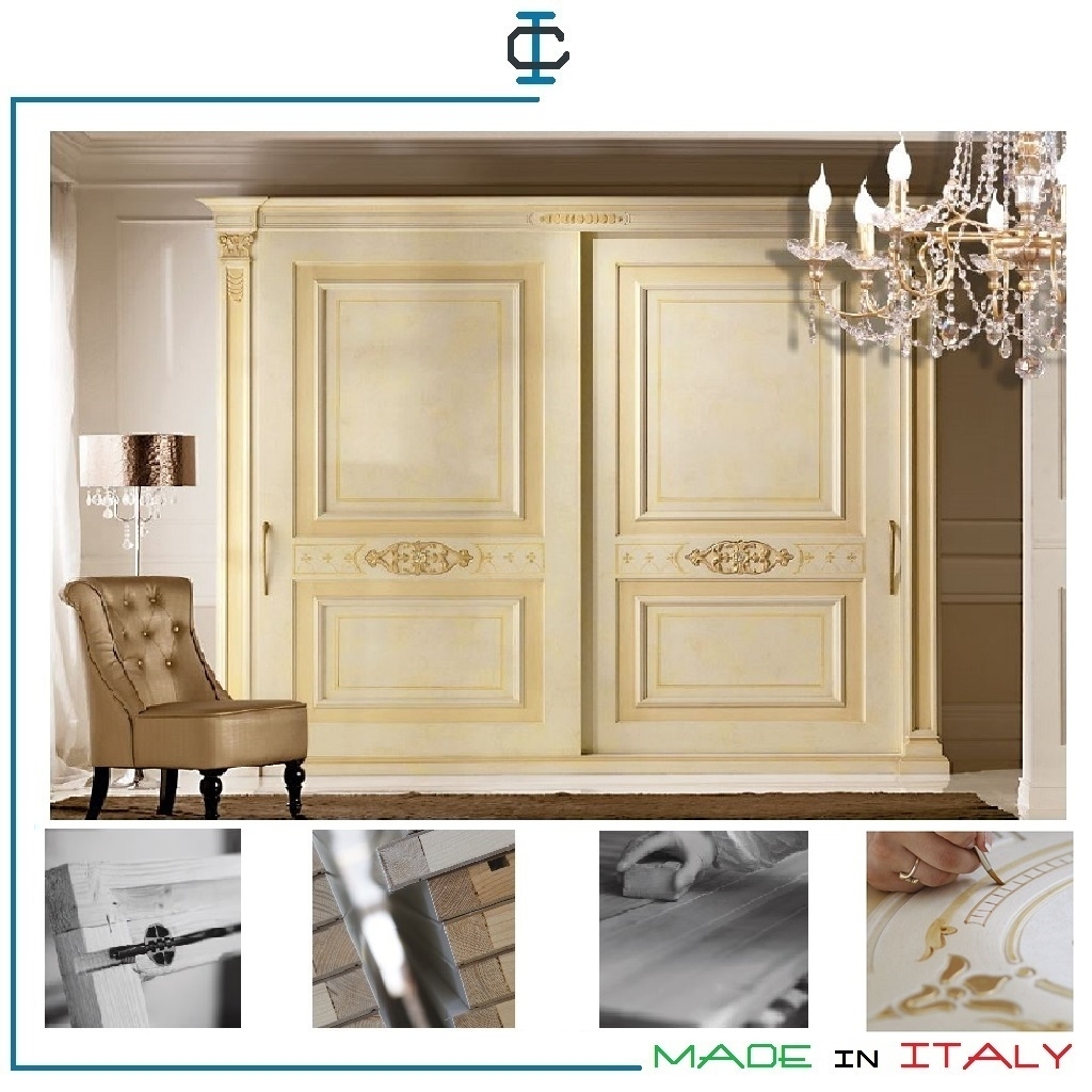 Armadio classico a due ante scorrevoli realizzato in legno tamburato con finitura antica Toscana. Fregi in argento decorati a mano. Attrezzatura interna composta da quattro aste appendiabito e due ripiani. Misure (cm): L.301 P.74 H.265