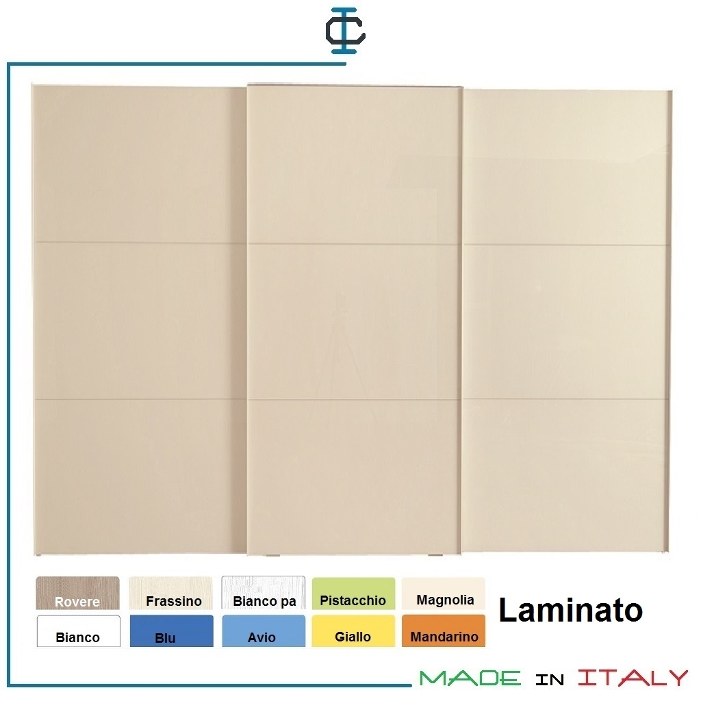 Armadio 3 ante scorrevole laminato con profili in alluminio. Colori e misure personalizzabili. Possibilità di taglio a misura. Struttura in pannello ecologico certificato. Due tubi ed un ripiano inclusi per ogni singolo vano. Design Contemporaneo