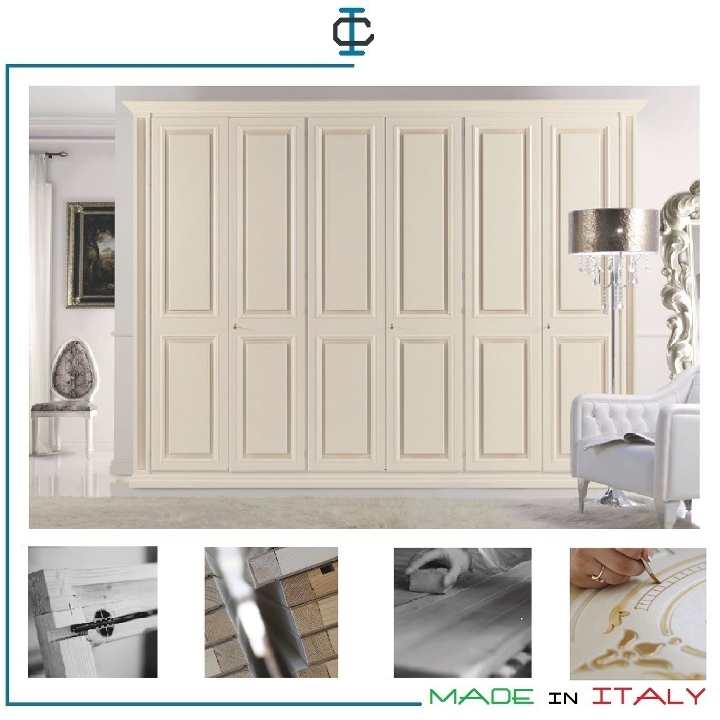 Armadio in stile classico a sei ante battente. Strutture in tamburato d'abete con finitura patinata tortora e decorazioni in terra d'oriente. Serratura con chiave, tre ripiani e sei aste appendiabito di serie. Misure (cm): L.312 P.65 H.256
