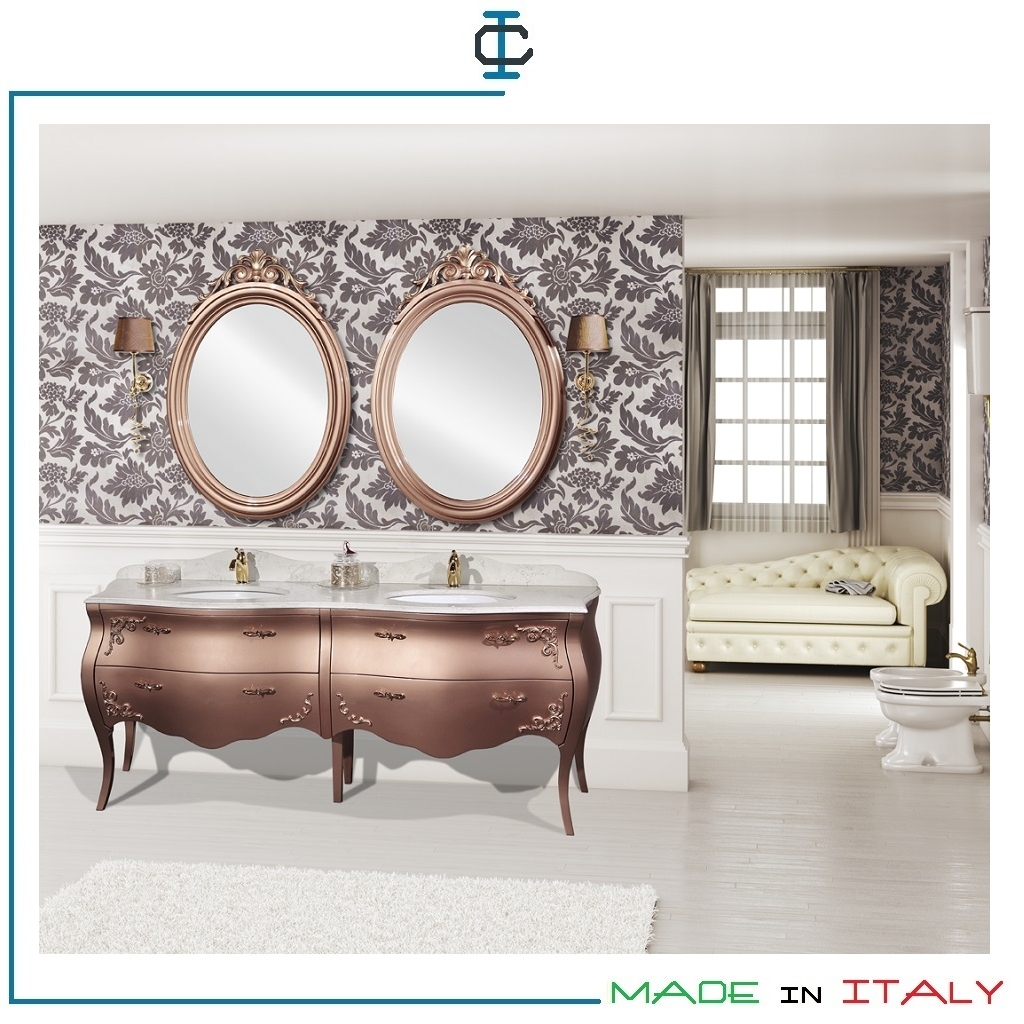 Base bagno con quattro cassettoni sagomati con gambe a sciabola, top in marmo con vasca in ceramica, specchio con cornice incisa ed applique. Finitura laccato rame con fregi oro. Misure: L.197 P.60 H.202