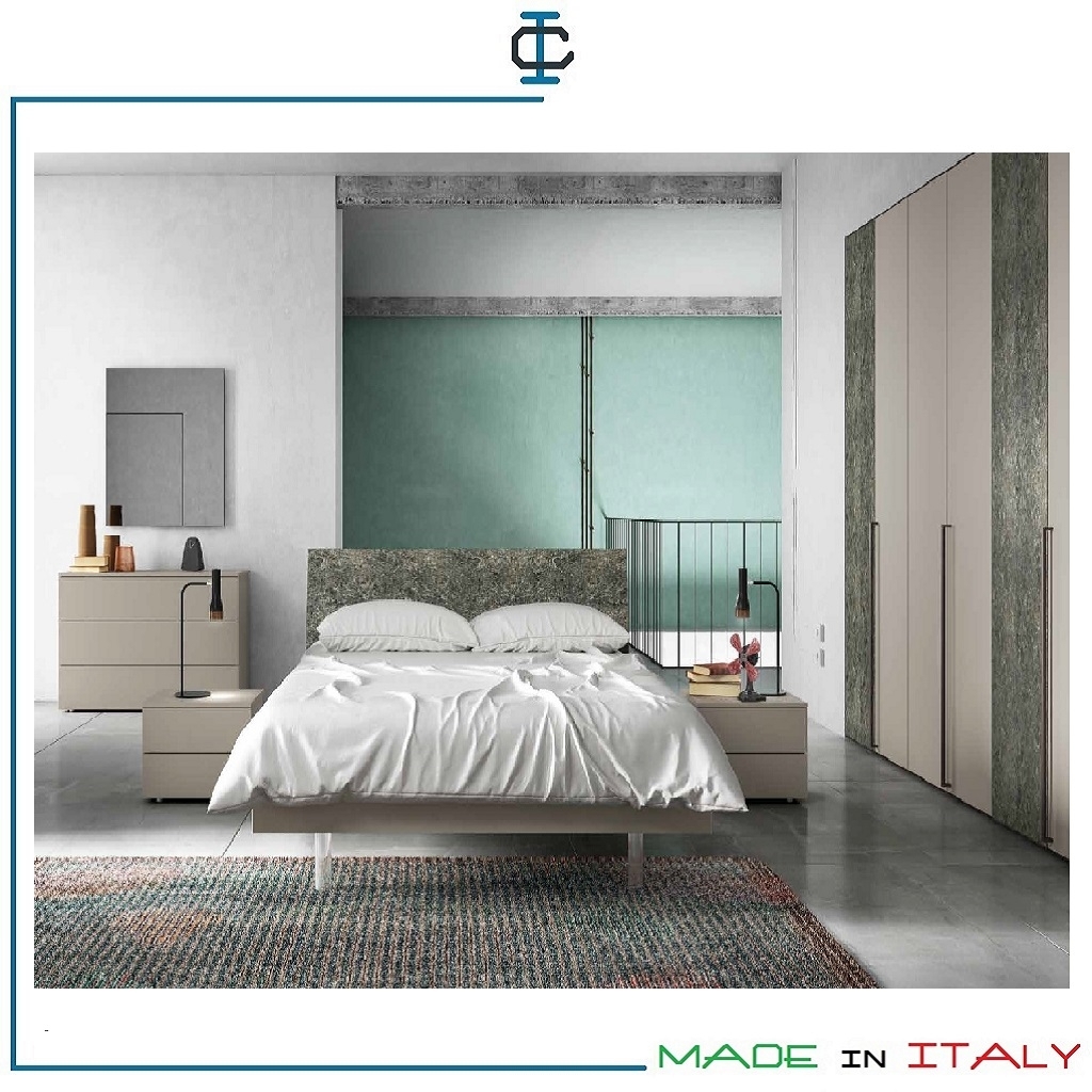 Camera da letto matrimoniale moderna composta da letto con testiera e giroletto, due comodini a due cassetti ed un armadio a sei ante battenti. Struttura pannello ecologico 25 mm con finitura in laminato. Rete e materasso opzionali.