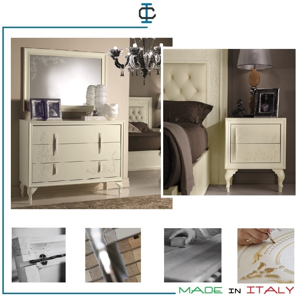 Comò e Comidini in stile classico con struttura in legno d'abete tamburato e finitura arte fiorentina a cera. Decorazioni realizzate a mano. Collezione Classics Made in Italy. Misure (cm):