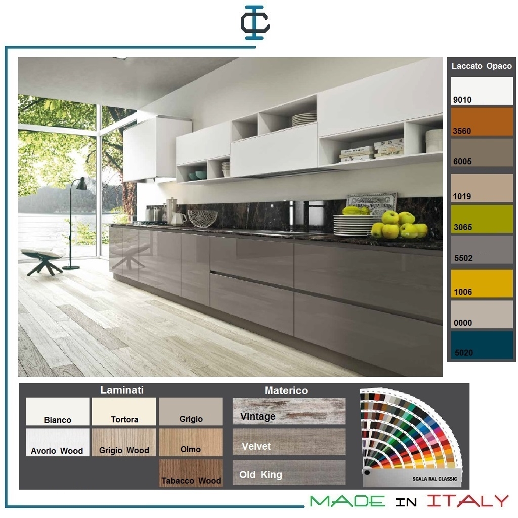 Cucina Laccata lucida Moderna con gola. Composta da zona cottura e lavello, pensili vasistas e pensili a giorno. Finitura in laccato con tinte a scelta. Materiali strutturali a scelta e colori configurabili. Design Contemporaneo.