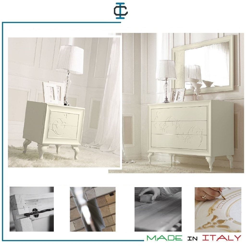 Comò e Comodini stile classico contemporaneo con due cassetti realizzati in legno tamburato. Finitura pennellata bianca realizzata a mano. Misure (cm):