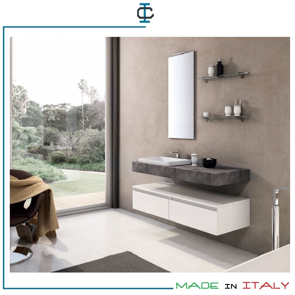 Composizione dal desgin moderno composta da un mensolone con lavabo in appoggio in mineral, due cestoni, specchio, lampada e mensola in vetro. Finitura top laminato cemento, cestoni laminato opaco. Strutture realizzate in pannello idrofugo V100. Produzione e Design Made in Italy certificato. Miscelatore non incluso. Misure: L.140 P.52 H.185 cm.