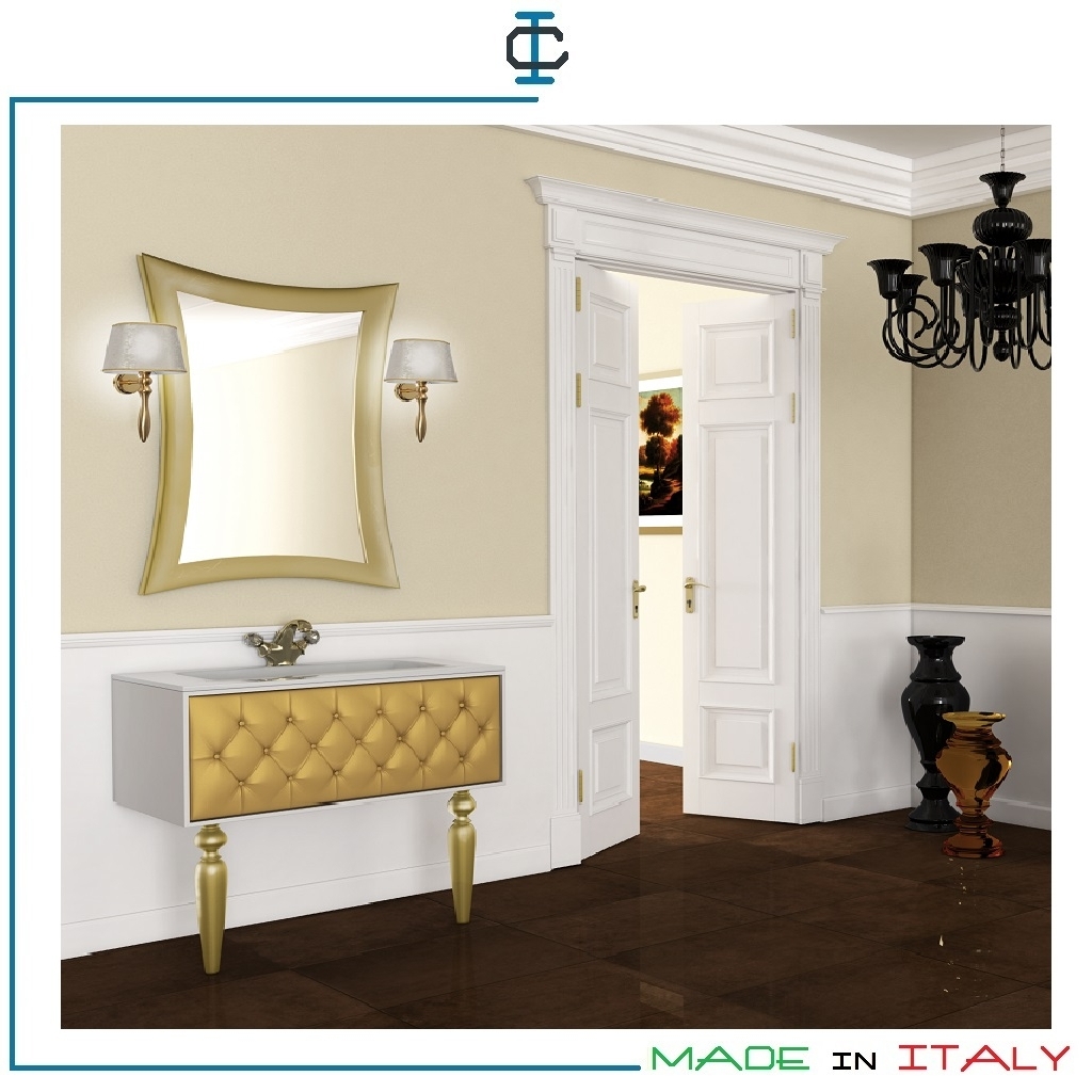 Mobile bagno sospeso con gambe tornite, top in cristallo bianco con vasca integrata, specchio ed applique. Finitura laccato bianco lucido con piedi tinta oro, frontali con pelle oro capitonnè e svarowski. Misure: L.90 P.50 H.207