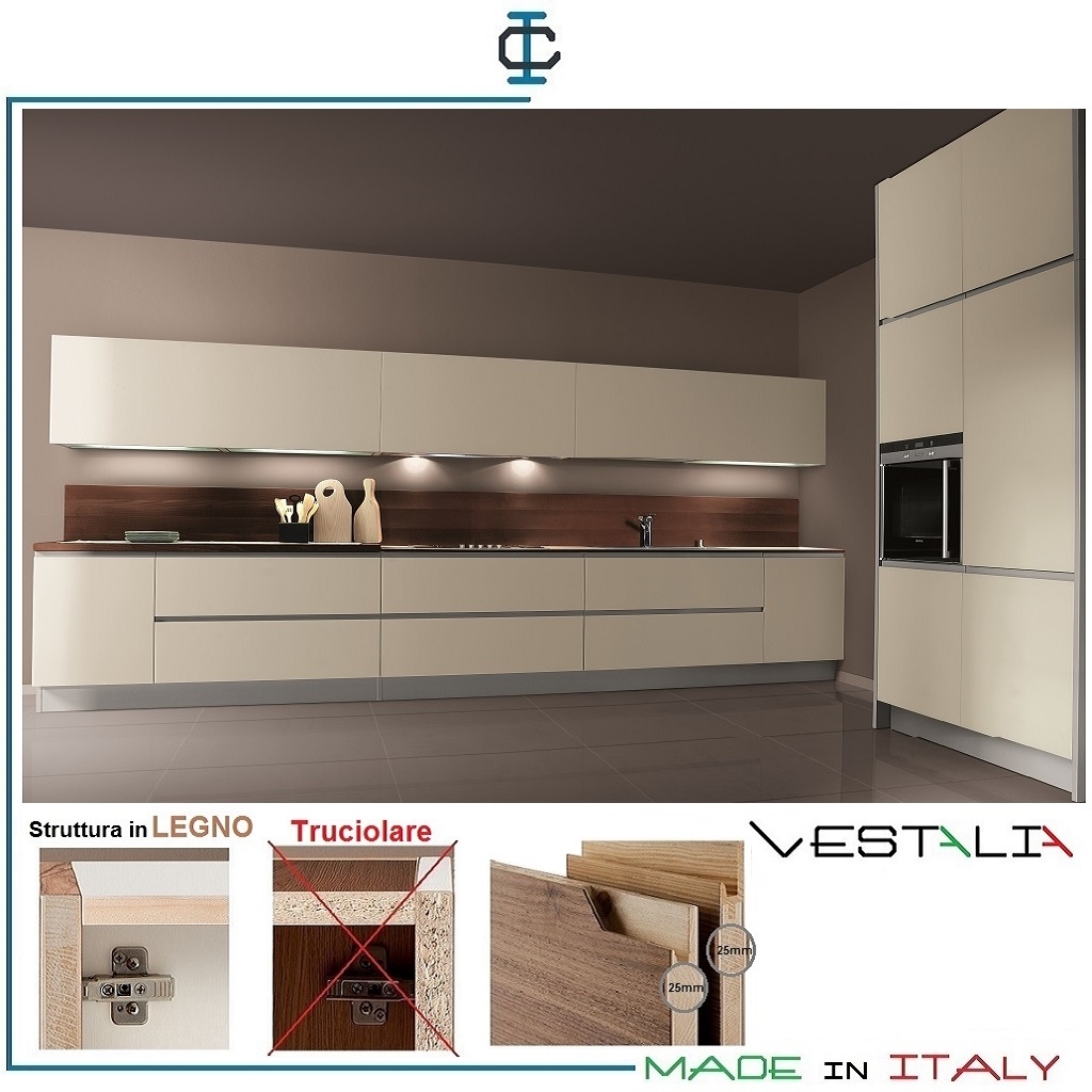 Ante in MDF laccate opache Struttura in legno listellare Cerniere con soft integrato Cassetti e cestoni con guide soft integrate Piedi e zoccolo h. 12 Top in Listellare sp.4 + Unicilor sp.2 Maniglia gola